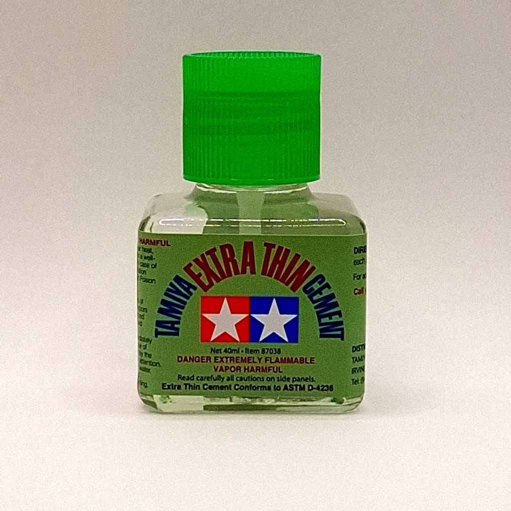 Tamiya 87038 Extra Thin Cement complete with brush applicator in a glass bottle.