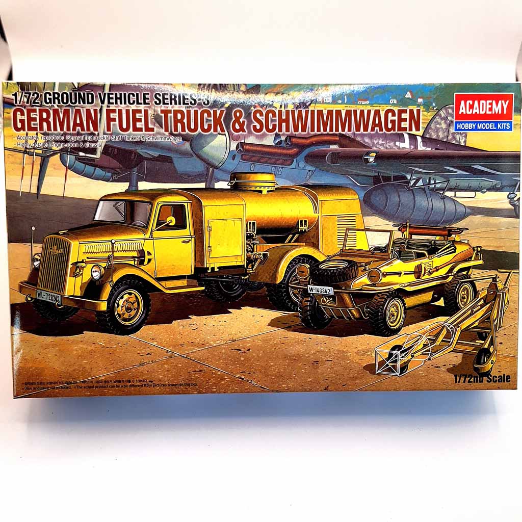 Academy 13401 1:72 Scale German Fuel Truck and Schwimmwagen. This plastic kit contains an Opel Blitz Fuel Bowser, Schwimmwagen and a Bomb Trolley. Paints and glue are not included in this set.