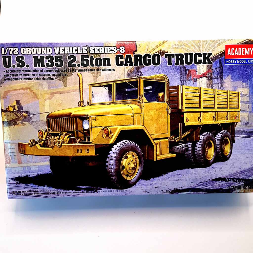 Academy 13410 1:72 Scale US M35 2.5 Ton Cargo Truck An accurately reproduced Cargo truck used US armed forces and alliances. Accurate re-creation of suspension and tyres. Plus meticulaus interior cabin detailing. Paints and glue are not included in this set.