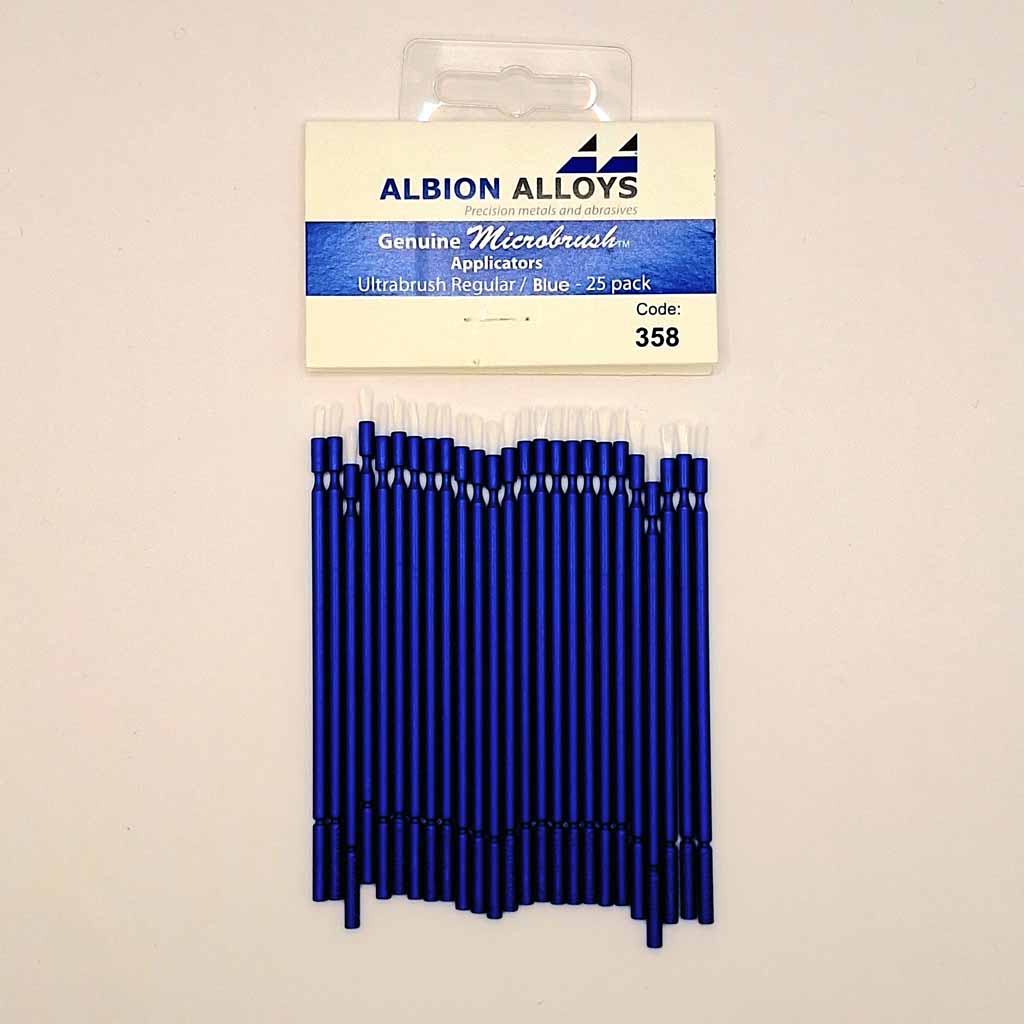 Albion Alloys 25pk Regular Brush Blue. For precise and accurate application of glue, paints, decal solutions etc. Flexible, tapered heads for easy positioning – excellent for those hard to reach places and compound curves.Items Green Yellow and White – application fibres are made from a non-absorbent, non-linting material which creates and holds a non-drip bubble of media ready for application.
