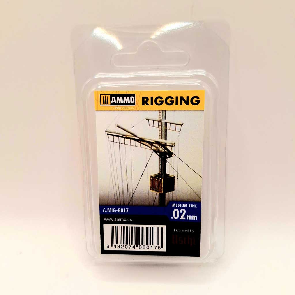 A wide variety of modeling subjects feature rigging from naval vessels, antennas, and wire rigging for WWI aircraft and civilian aircraft subjects. Adding this critical detail to our kits was a difficult task until now. Rigging from AMMO is the most versatile and easy to use rigging product available today. The elasticity will enable you to work with ease, never snapping, breaking, or bending line during assembly. Black material makes it easy to see in fine scales, all Rigging is paintable allowing for realistic replicas. This product is the perfect solution for rigging and wiring naval vessels, aircraft, and civil vehicles in all scales. Use A.MIG-8013 Cyanoacrylate for assembly. Each blister comes with 2 meters (6.5 feet) of rigging material.