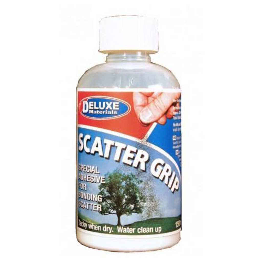 Deluxe Materials AD25 Scatter Grip 150ml.Special adhesive which dries tacky allowing plenty of working time for bonding scatter materials. Ideal for railway layouts, gardens, dolls house scenery.