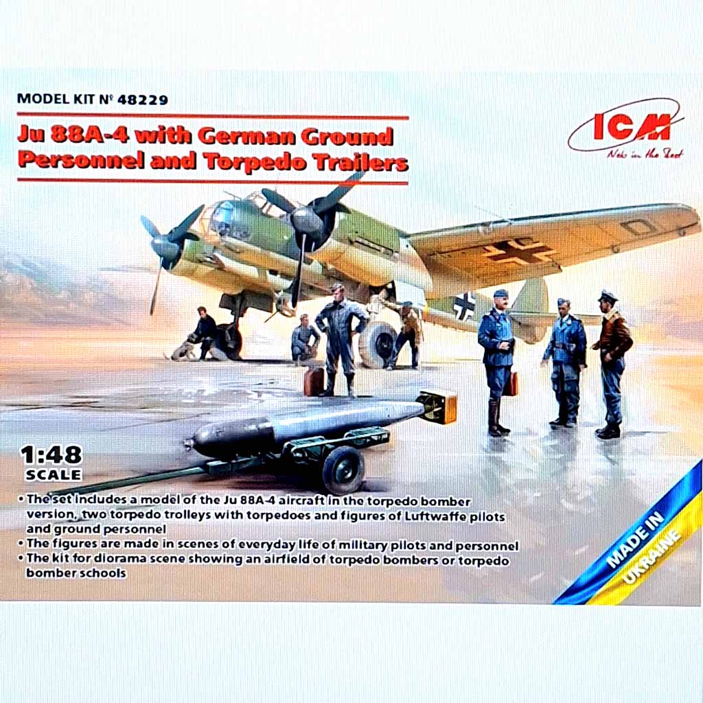 ICM 48229 Ju 88A-4 with Ground Personnel & Torpedo Trailers 1:48 Scale.Paints and glue are not included in this set.