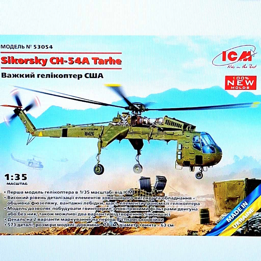 ICM 53054 Sikorsky CH-54A Tarhe US Heavy Helicopter 1:35 Scale.The CH-54 Tarhe helicopter was developed by Sikorsky Aircraft, a company founded by the prominent Ukrainian aircraft designer Igor Sikorsky. The first flight of the helicopter (originally named S-64) took place on May 9, 1962.