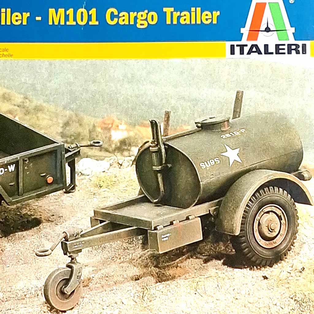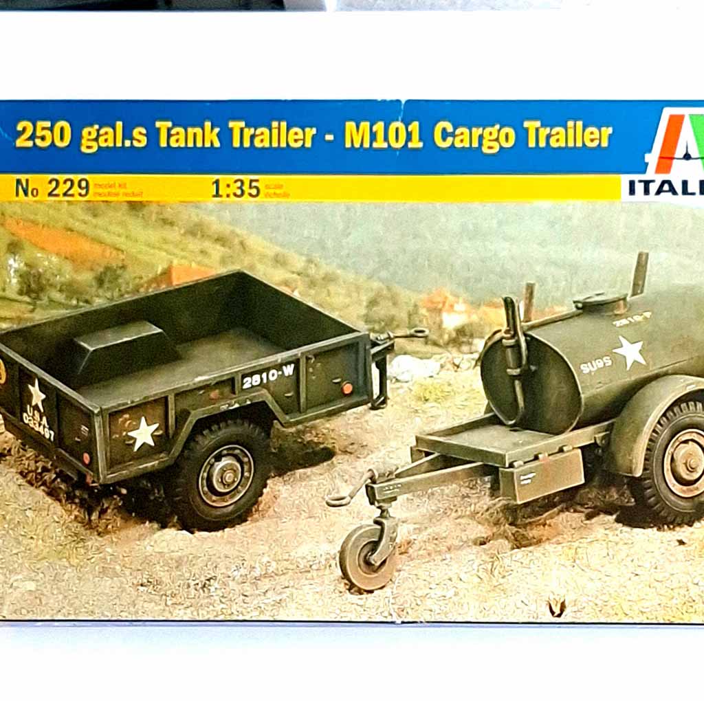 Italeri 229 1:35 Scale US 250 Gallon Tanker and M101 Open Trailer. A brilliant addition to any WW2 Diorama. Paints and glues are not included with this model kit