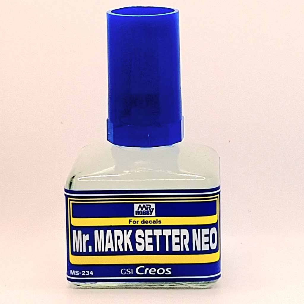 Mr Hobby Mr Mark Setter 40ml. Mr. Mark Setter is an adhesive component, which gives decals greater adhesion to plastic parts. It is much easier to affix decals to plastic model part where the parts either have a rough or irregular surface. First, the area to which the decal will be affixed is painted and then the decal is applied. After any air bubbles are removed by pressing on the decal with a cotton swab, a coating of Mr.Mark Setter is applied and allowed to dry. Because the decal now has a greater degree of adhesion, adhesive silvering (the floating and shiny quality of the clear parts of decals) will be greatly reduced or eliminated, and decals can be firmly affixed to uneven surfaces. It is perfect even for poorly made decals. Decals will have greater adhesion if the painted surface is prepared with a gloss finish.