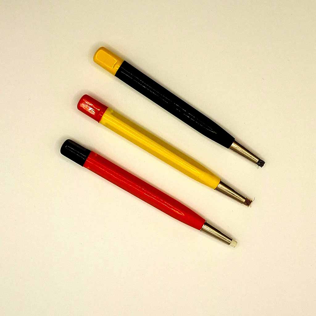 3 piece Scratch Brush Set.Set of 3 Metal Ferrule Scratch Brushes. Fibre Glass (Soft) Brass (Medium) and Steel (hard). Scratch Brushes work well for rust and removing corrosion, cleaning out burrs from twist drills and cleaning and polishing various other items, such as scale Railway Tracks.Bristles are advanced and retracted by turning the end of the brush. Use for Electronic Semi-Conductor Industries, Model Making, Craft, Hobby, watch and jewellry applications, the list goes on…