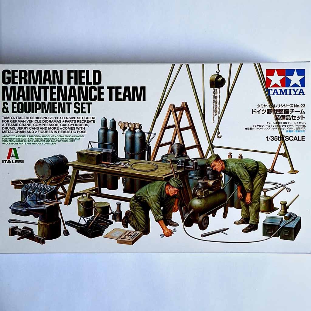 Tamiya 37023 1:35 Scale German Field Maintenance Team and Equipment Set. This is a Tamiya-Italeri Series model kit based upon the Italeri 1/35 Field Work Shop kit. This set has newly-molded parts, plus Tamiya figures, accessories and instruction manual, all packaged in a new Tamiya box! It can be constructed into a diorama by itself, or used in conjunction with products from Tamiya’s huge range of German vehicle model assembly kits to create a highly realistic diorama scene.