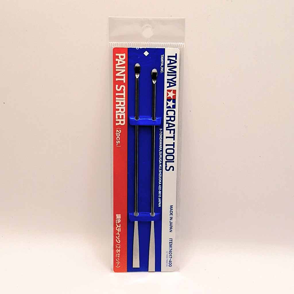 Tamiya 74017 2pc Paint Stirrer Set.This stainless steel tool is designed for stirring bottle paints, and for blending different color shades. One end is shaped like a small spoon, while the other is flat, like a spatula. Tool length is 150mm. Includes two stirrers.