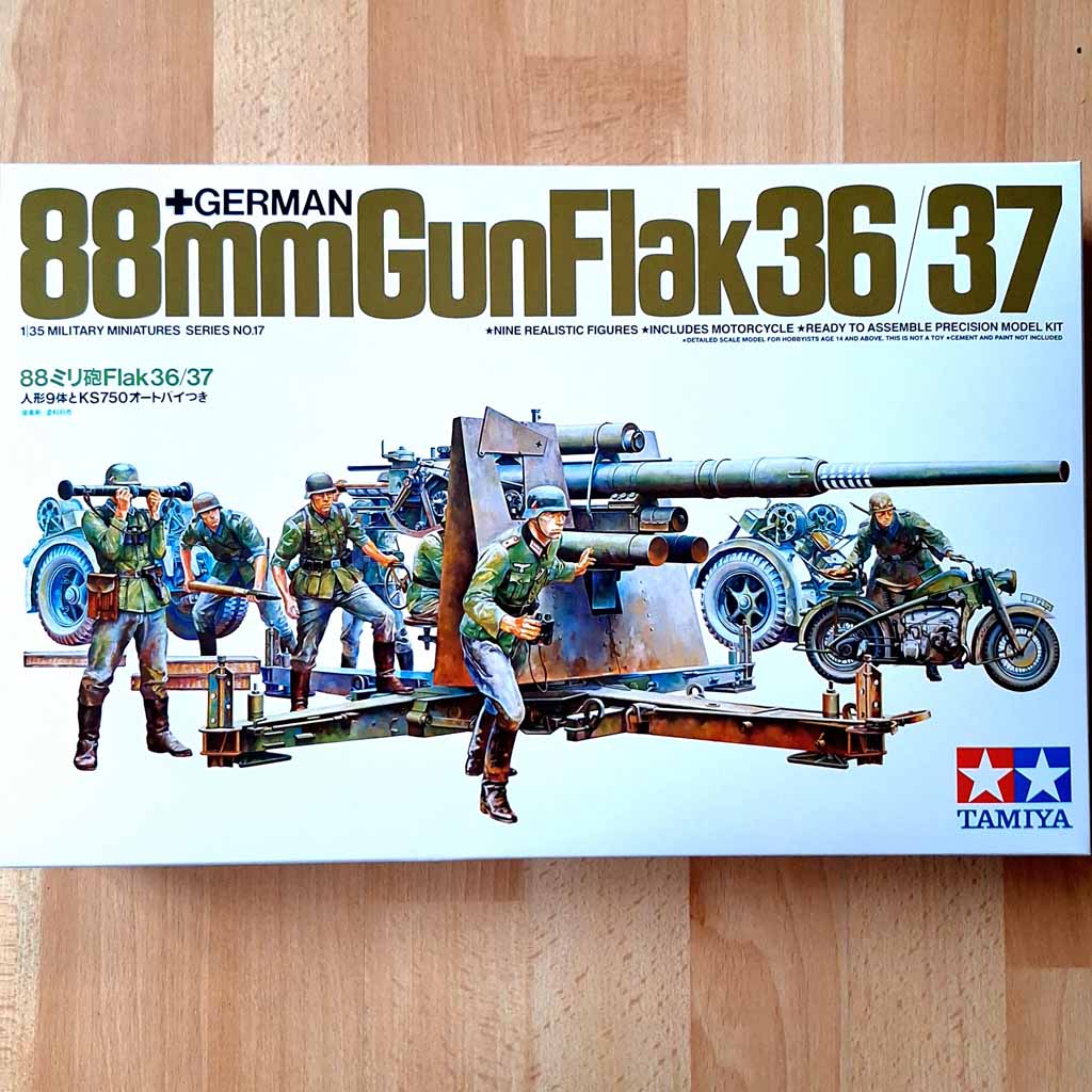 Tamiya 35017 German 88mm Gun Flak 36.37 Kit 1:35 Scale. This famous weapon is well known for its role in World War II. It did, in fact, have its origins during the first World War, when guns of this calibre were used in an anti aircraft role. No paints or glues are supplied with this model kit.