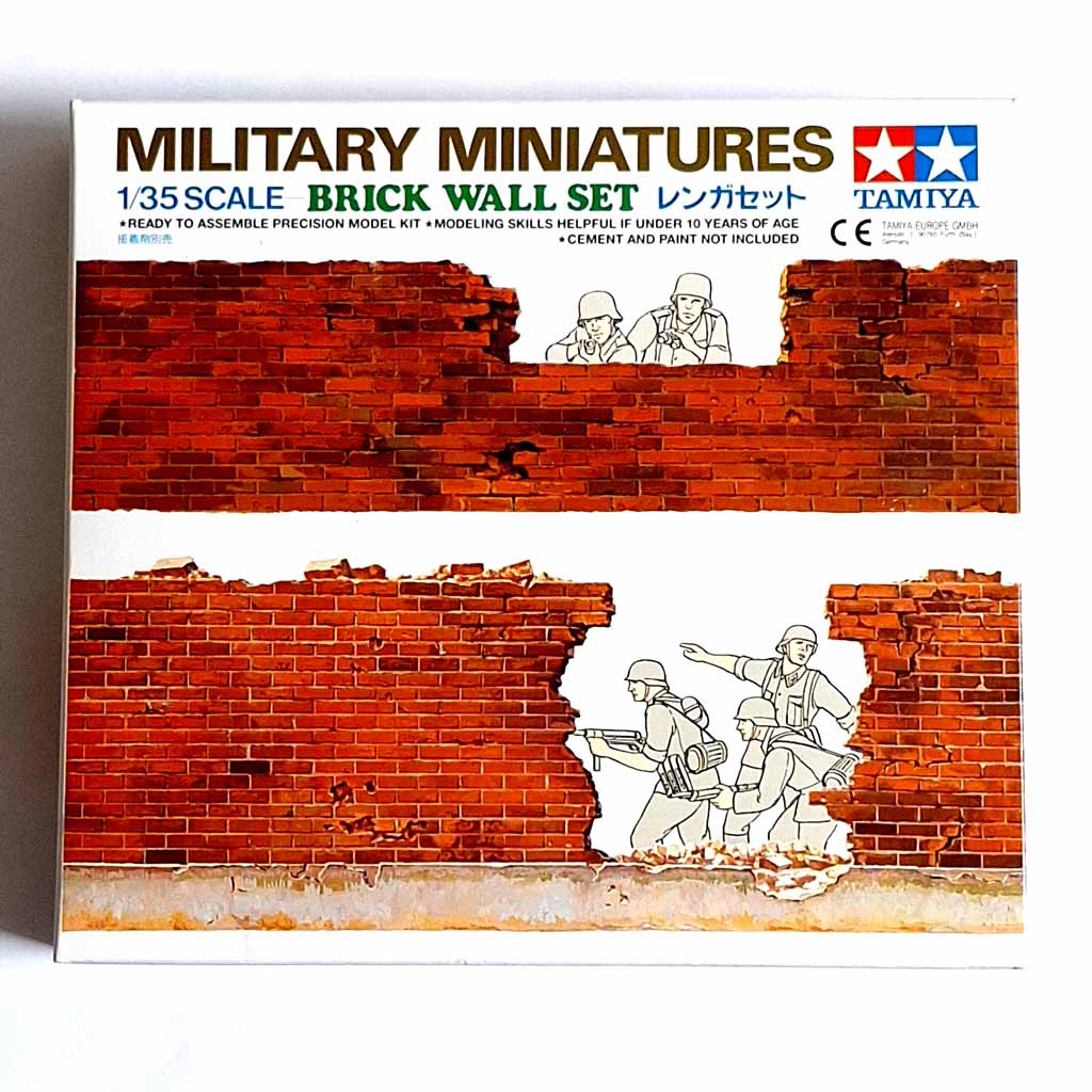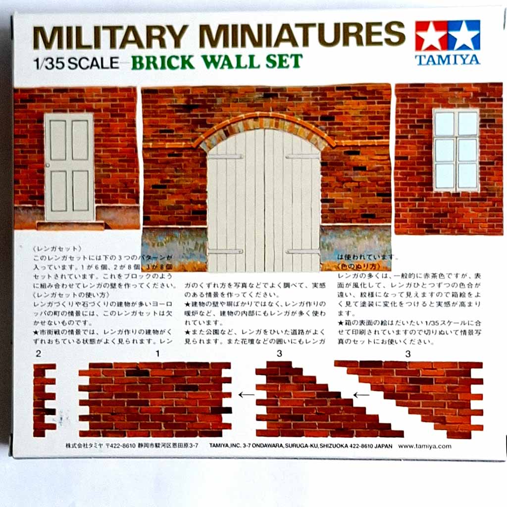 Tamiya 35028 1:35 Scale Brick Wall Set. This plastic model kit recreates brick wall sections that add to a diorama. It includes three diiferent wall sections and the box art can also be cut out to add background.Paints and glues are not included with this model kit.