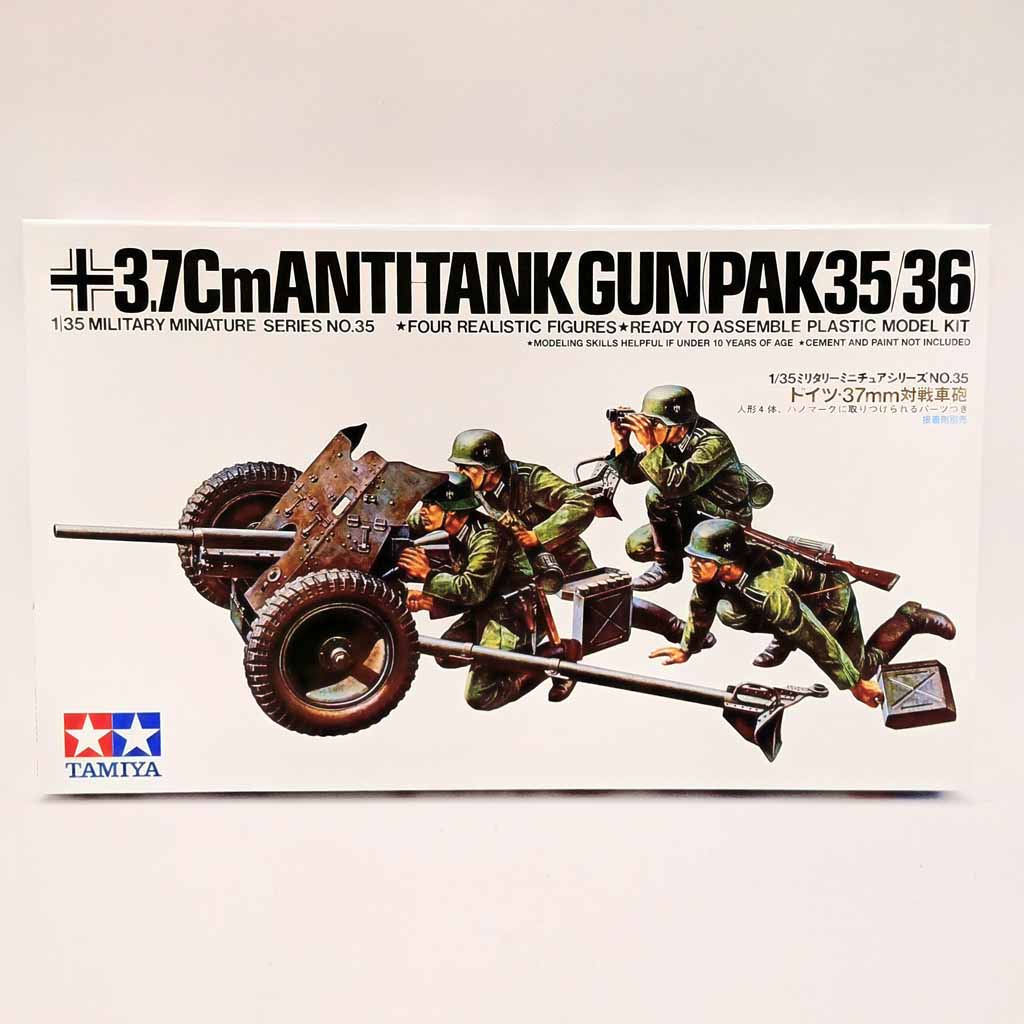 Tamiya 35035 German 37mm Anti-Tank Gun Kit 1:35 Scale. This is a 1/35 scale plastic model assembly kit depicting the 37mm Pak35/36 anti-tank gun deployed by German WWII forces. The gun is comprised of numerous parts for an authentic look. It offers elevation and traverse movement. Choose between standard and late-war barrels. Comes with various accessories and four figures as a mini-diorama in its own right. No paints or glues are supplied with this model kit.