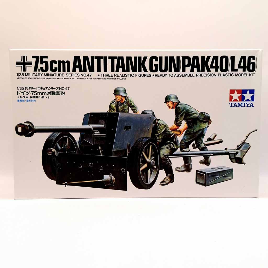 Tamiya 35047 German 75mm Anti-Tank Gun Kit 1:35 Scale. The 7.5 cm anti-tank gun was to become the main and typical anti-tank weapon of the German Army. It was often towed by the 3-ton tractor Sdkfz 11. With the progress of the war situation, the gun combined with the chassis of a fighting vehicle, including the Pzkpfw IV to make up a great number of tank destroyers or self-propelled anti-tank guns that rendered distinguished services thereafter.