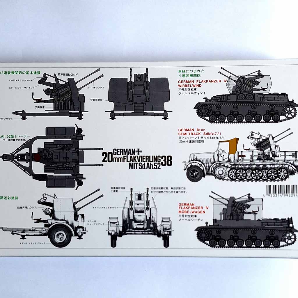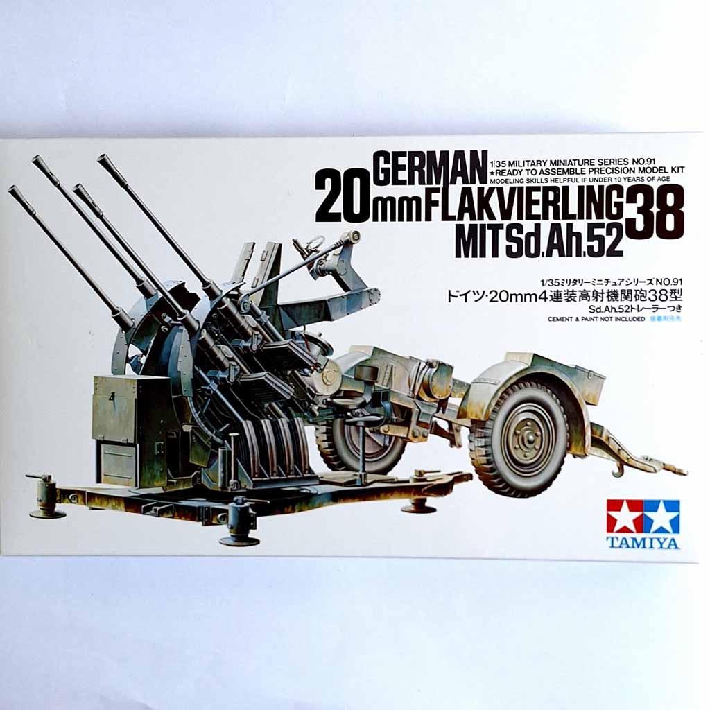 Tamiya 35091 German 20mm Flakvierling 38, 1:35 Scale model .This is a plastic model assembly kit of German type 20mm high-firing cannon that was feared by Allied pilots, with an excellent firing speed of 600 shots / minute. It has been used extensively, including mounted on ships and ships. Sharp barrels and shell cartridges that look into the sky, operation handles and pedals are reproduced in a rich sense of depth. The barrel is movable up and down, left and right. A transport trailer is also set, and can be assembled by selecting the transportation state and shooting state.Paints and glues are not included in this set