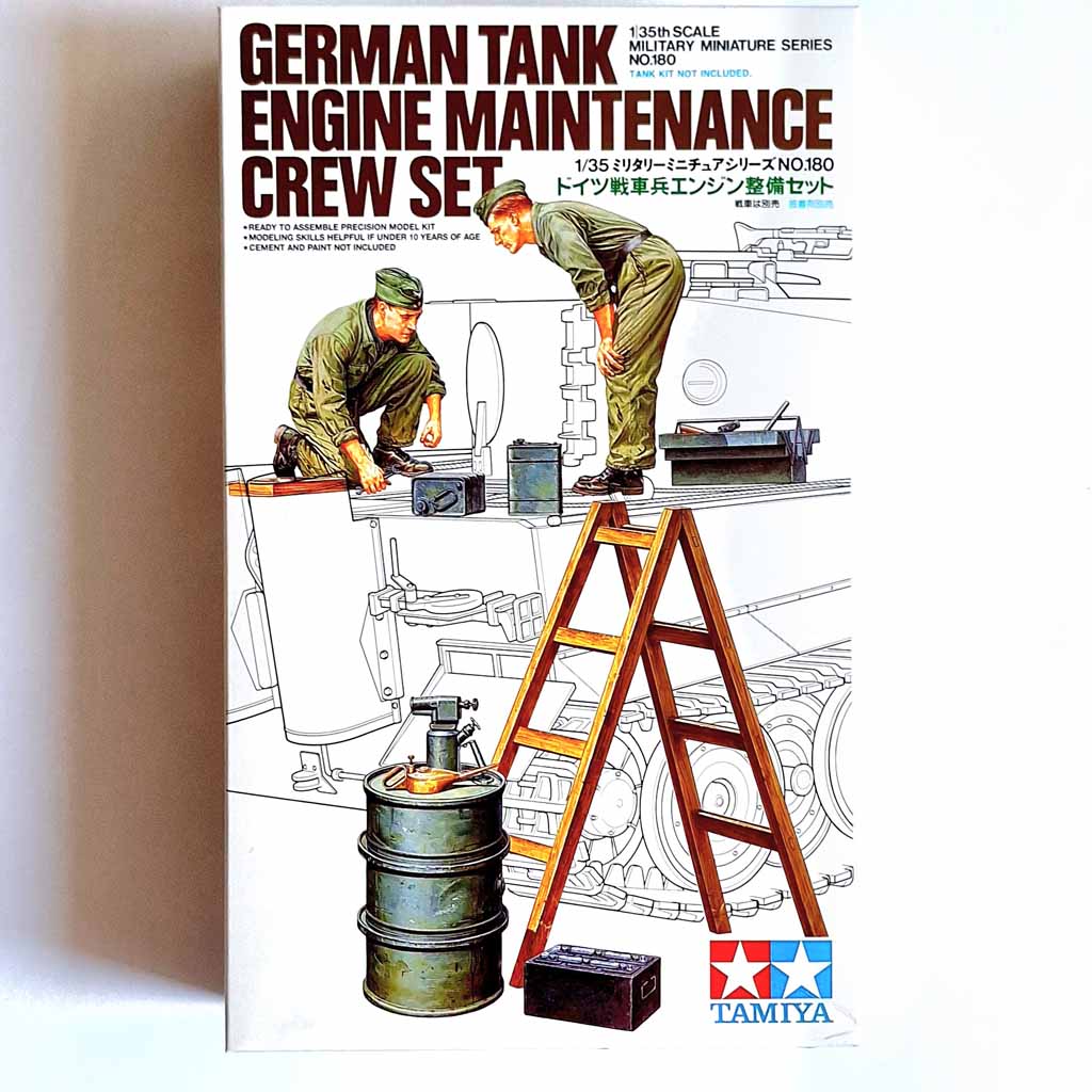 Tamiya 1:35 Scale 35180 German Tank Engine Maintenance Crew Set. Two German Tank Maintence Men figures & some repair accessories. A nice extra touch to dioramas. Paints and glues are not included in this set