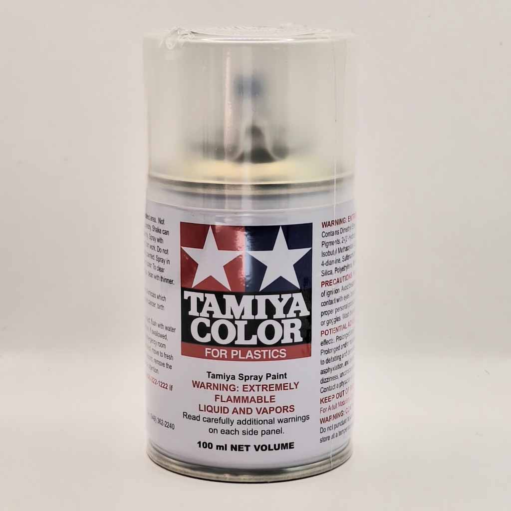 Tamiya 85080 TS-80 Clear Flat Acrylic Spray Paint. These cans of spray paint are extremely useful for painting large surfaces. The paint is synthetic lacquer that cures in a short period of time. Each can contains 100ml of paint, which is enough to fully cover two or three 1/24 scale sized car bodies. Tamiya spray paints are not affected by acrylic or enamel paints; therefore, following an overall base coat, details can be added or picked out using enamel and/or acrylic paints. By combining the use of these three types of paints, the finishing of plastic models becomes simpler and more effective.