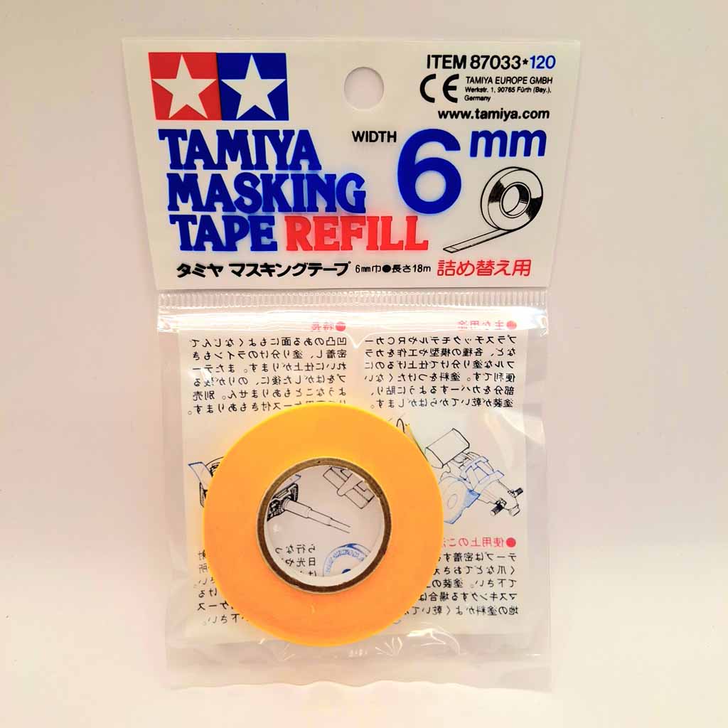 Tamiya 87033 6mm x 18metre Masking Tape. Tamiya Masking Tape is a thin, very strong adhesive tape for modeling use. It even adheres well to uneven surfaces. It’s ideal when sharp and crisp lines are required. This tape will not absorb paint color, or leave unsightly marks, making it perfect for use with painted or unpainted scale plastic or radio control models.