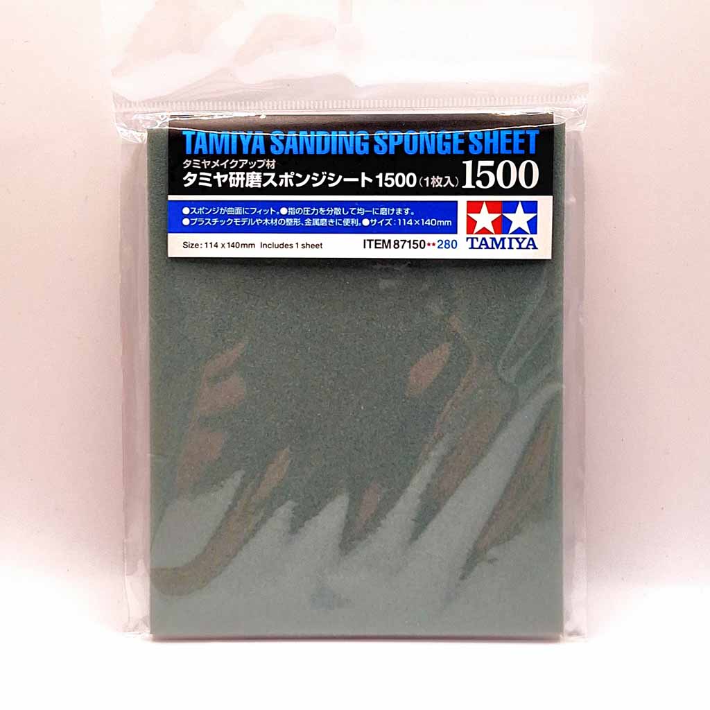 Tamiya 87150 1500 Grit Sponge Sanding Sheet. Attached to a flexible sponge base, the abrasive coat of this sanding sheet is well-suited for removing protrusions on plastic models and also finishing materials such as wood and metal. The sponge’s flexibility allows even finishing of curved surfaces and hard-to-reach corners. This item can be easily cut into the desired shape/size using a modeling knife. Note: Suitable for wet sanding use. Tamiya Sanding Sponge Sheet x1,Dimensions: 114 x 140mm, Abrasive material: Aluminum oxide, Sponge thickness: 5mm