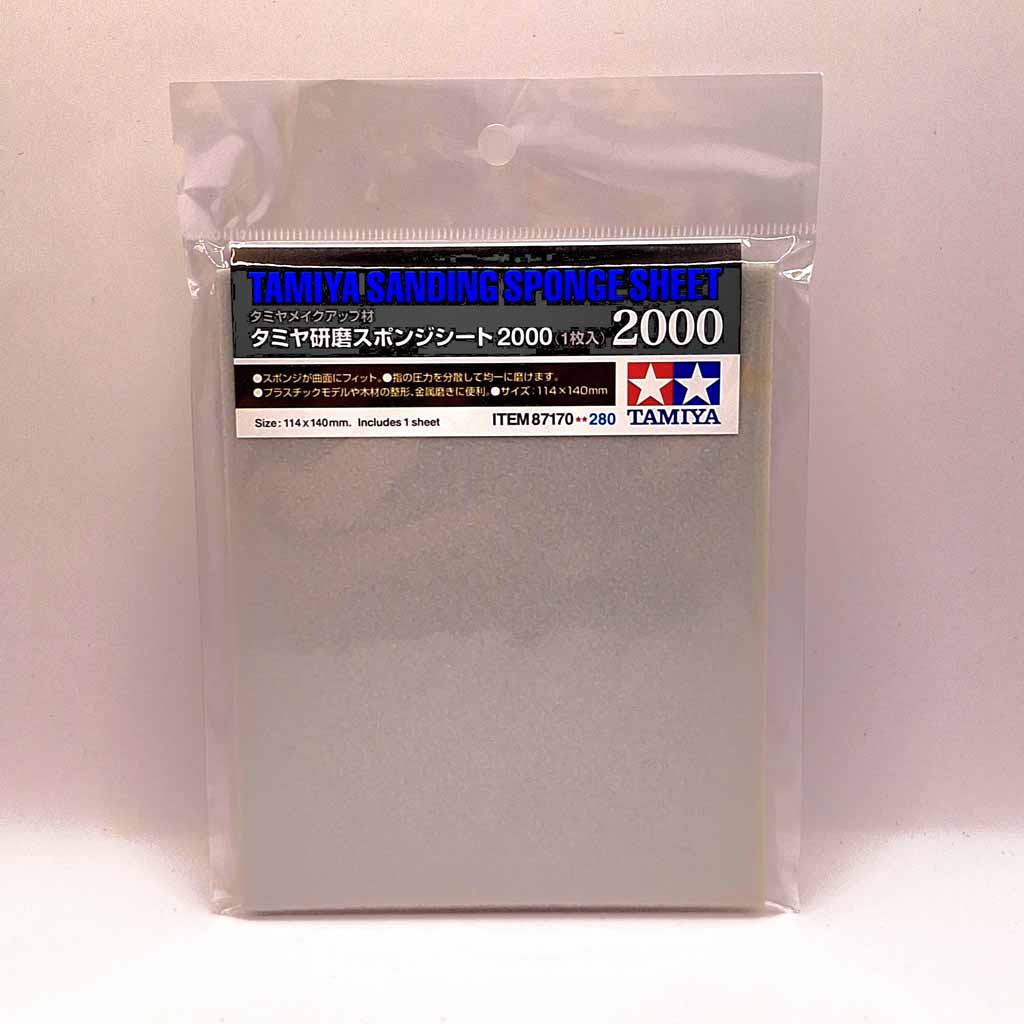 Tamiya 87170 2000 Grit Sponge Sanding Sheet. Attached to a flexible sponge base, the abrasive coat of this sanding sheet is well-suited for removing protrusions on plastic models and also finishing materials such as wood and metal. The sponge’s flexibility allows even finishing of curved surfaces and hard-to-reach corners. This item can be easily cut into the desired shape/size using a modeling knife. Note: Suitable for wet sanding use. Tamiya Sanding Sponge Sheet x1,Dimensions: 114 x 140mm, Abrasive material: Aluminum oxide, Sponge thickness: 5mm