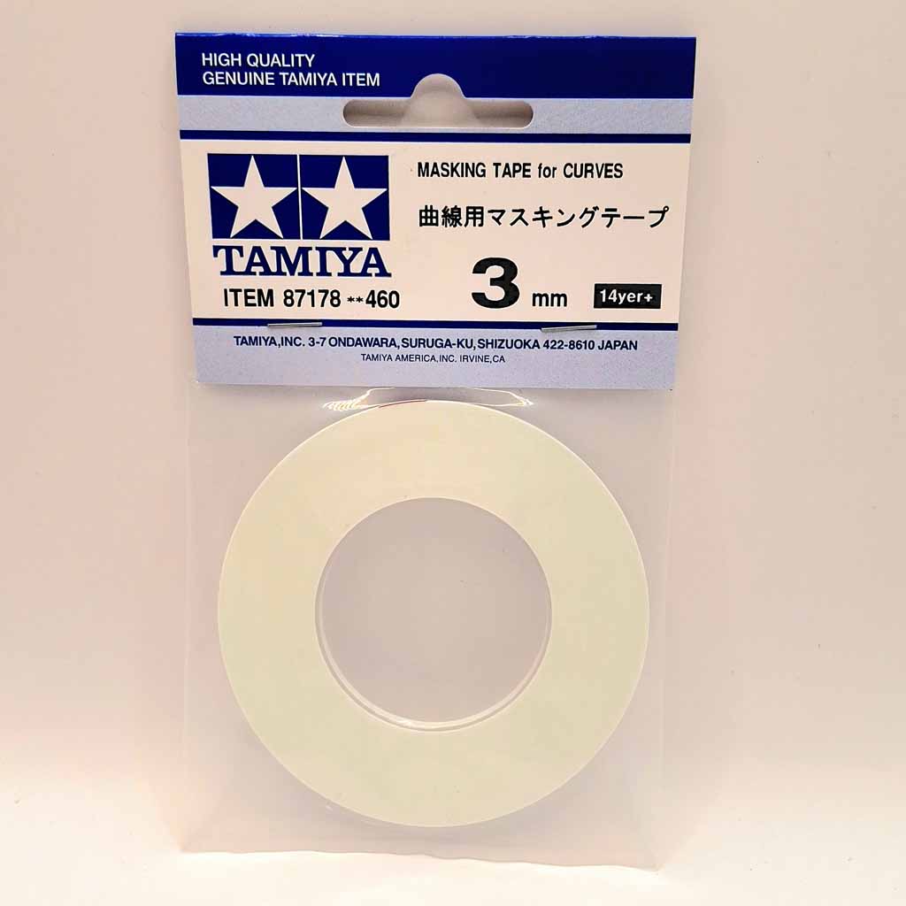 Tamiya 87178 3mm x 20metre Masking Tape for Curves. Masking is a job which modellers of all kinds of models in every scale must carry out, and it requires precision to ensure that your creation gets the perfect paint job. This masking tape helps in the process, allowing smooth and secure masking-off of curved lines where standard masking tape would sustain creases and possibly let paint seep underneath. This tape is available in 3 separate widths to meet a variety of needs such as 2mm, 3mm and 5mm respectively. A soft resin material is used, allowing the tape to adhere in a curved line while preventing paint from seeping into masked off areas.
