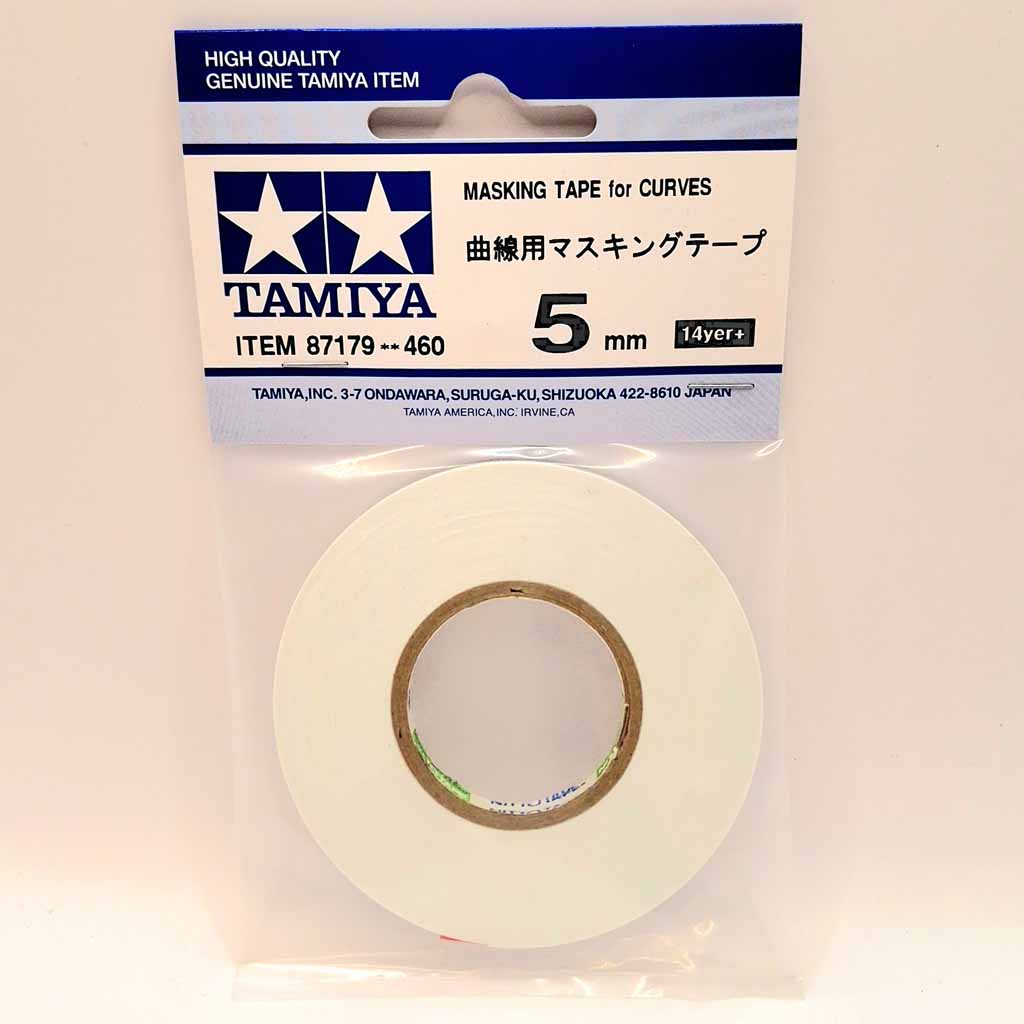 Tamiya 87179 5mm x 20metre Masking Tape for Curves. Masking is a job which modellers of all kinds of models in every scale must carry out, and it requires precision to ensure that your creation gets the perfect paint job. This masking tape helps in the process, allowing smooth and secure masking-off of curved lines where standard masking tape would sustain creases and possibly let paint seep underneath. This tape is available in 3 separate widths to meet a variety of needs such as 2mm, 3mm and 5mm respectively. A soft resin material is used, allowing the tape to adhere in a curved line while preventing paint from seeping into masked off areas.