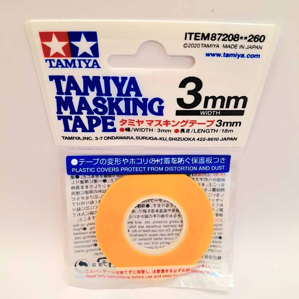 Tamiya 87208 3mm x 18metre Masking Tape. This slim 1mm masking tape can be used on subjects such as plastic and R/C models. PET plastic covers help prevent distortion and allow minimal dust to settle on the tape for superior longevity. The tape is exceedingly useful in any masking situation, but particularly in fine paint jobs or intricate and complex livery designs.