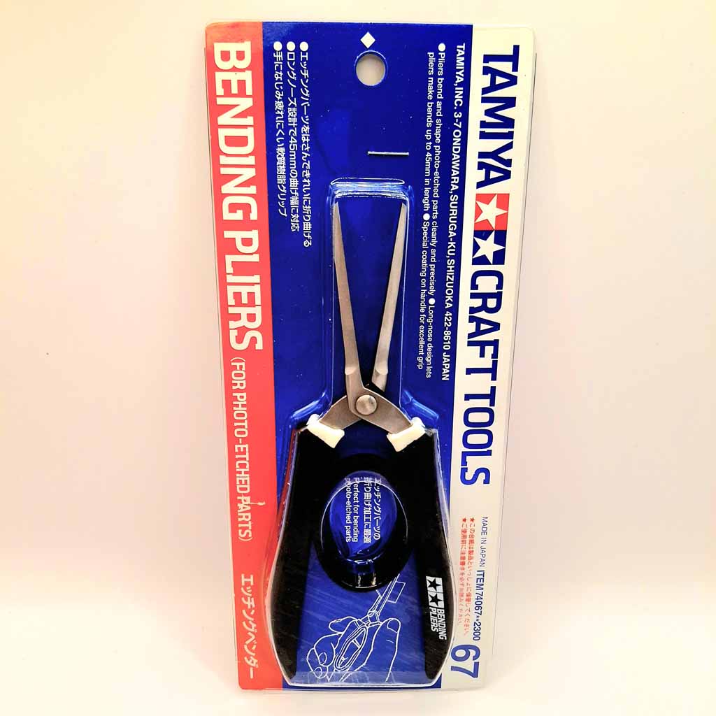 Tamiya Bending Pliers For Photo-Etched Parts 74067. Long-nosed pliers specially designed for use with photo-etched parts. Guaranteeing precision bending for all sized pieces, the tip of the pliers is designed for use with small parts while the side is meant for bending large parts. Easy grip handle provides comfortable use whilst maintaining premium control.