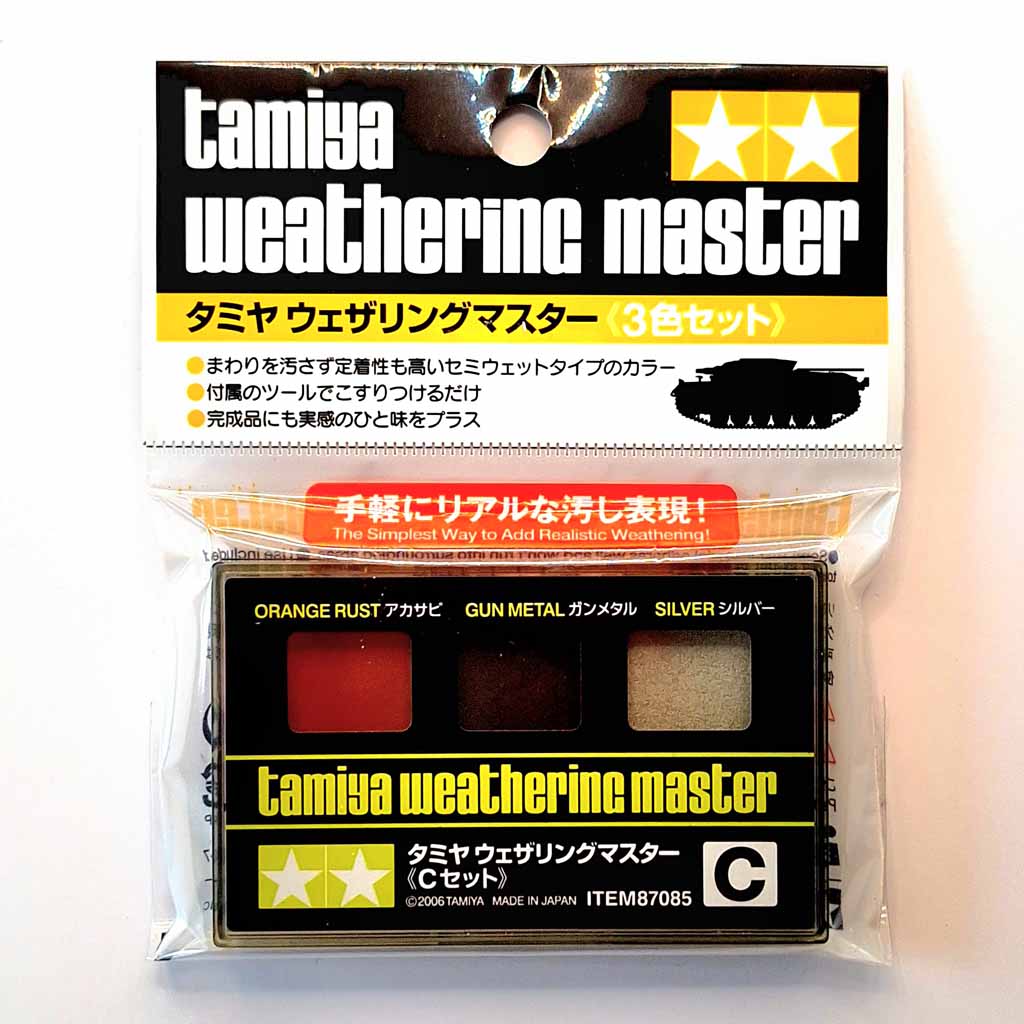 Tamiya Weathering Master C Set, set of Metallic Colours: Orange Rust(for orange/red tinted rusty metal), gun metal (forunpolished metal look) and silver (for polished metal look).