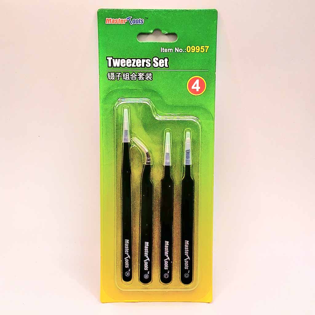 Trumpeter 4pc Tweezer Set. This set comprises of: 1 x Fine Tipe Long Straight Tweezer 1 x Fine Tipped Curved Tweezer 1 x Fine Tip Straight Tweezer 1 x Flat End Tweezer