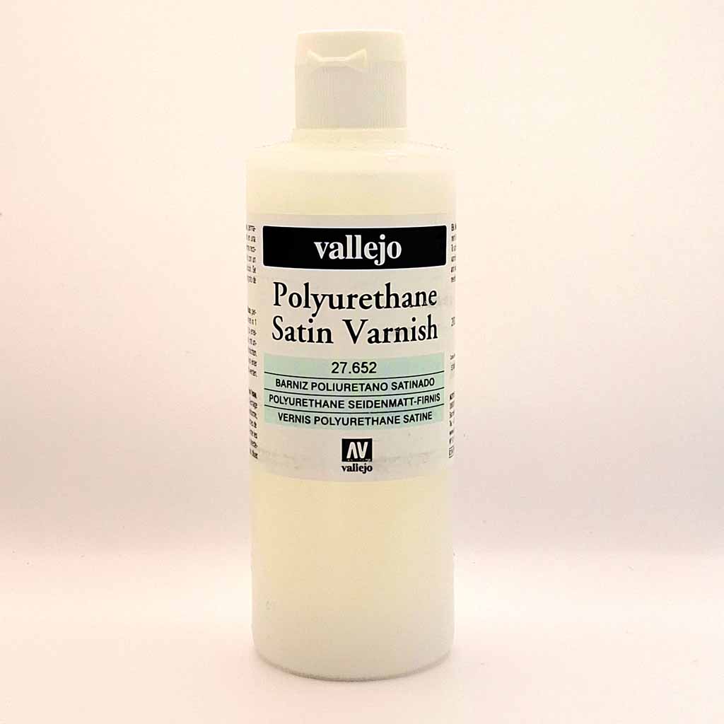 Vallejo 27652 200ml Polyurethane Satin Varnish.Water based polyurethane varnish formulated with the most recently developed resin. This varnish has the superior resistance of polyurethane and the ease of application of water-based products. U.V. Resistant.