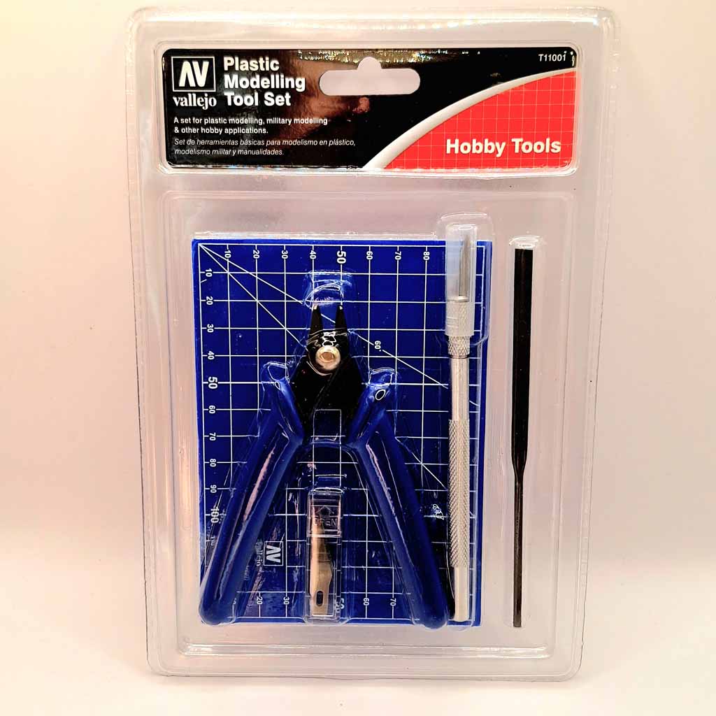 Vallejo T11001 Plastic Modelling Toolset. For plastic modeling, military modelLing and other hobby applications. Includes plastic sprue cutter, knife no. 1, #11 blades (x5), cutting mat and flat file.