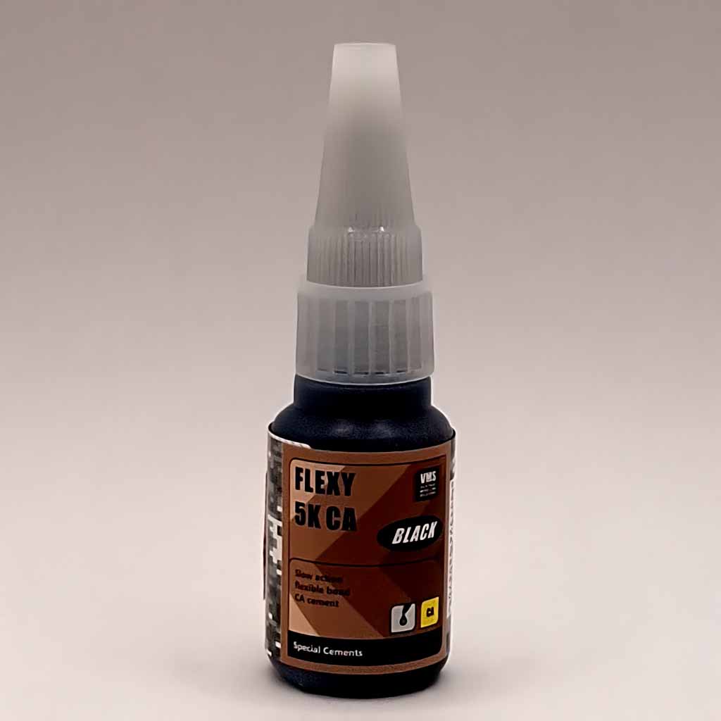VMS CM10 20g Flexy 5K Black CA Glue. A favourite glue for cementing photo-etched parts, BLACK variety for extra control. This CA glue forms flexible bond that withstands much more punishment than classic brittle CA. This essentially means less accidentally lost parts and more productive and enjoyable work as there is much less need to reglue vulnerable parts. Extended open time (150% the standard CA) allows for good positioning of the parts. You also will be able to glue tricky parts (both PS and metal) that produce tension. Flexy is less aggressive and more easily removed when necessary it doesn’t “eat plastic” as classic CAs. Combine with: photo-etched parts + polystyrene